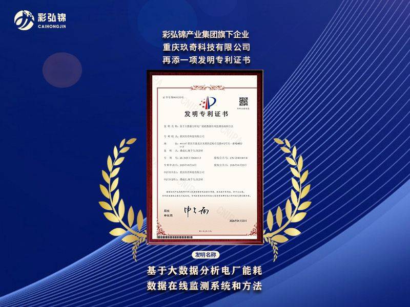 近日,彩弘锦产业集团旗下企业重庆玖奇科技有限公司再获发明专利,专利名为“基于大数据分析电厂能耗数据在线监测系统和方法”。